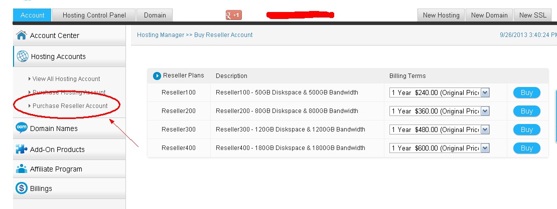 2. For our existing customers who wants to be our reseller can purchase it within hosting control panel >> Hosting Accounts >> Purchase Reseller Account.