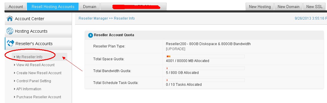 You can check your reseller plan type & total space quota & total bandwidth quota and total schedule task quota here.
