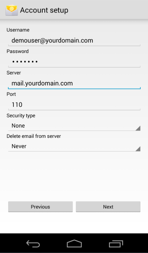 POP3 server is mail.yourdomain.com, please replace yourdomain.com to your real domain.
