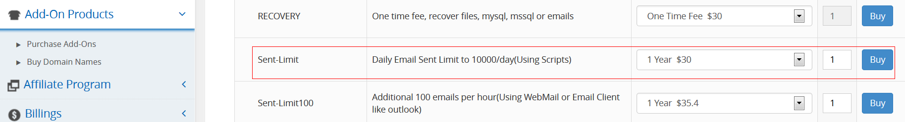 (1). Please login to your member account-->Add-On Products-->Purchase Add-Ons, you will find a product name "Sent-Limit", click buy to buy it