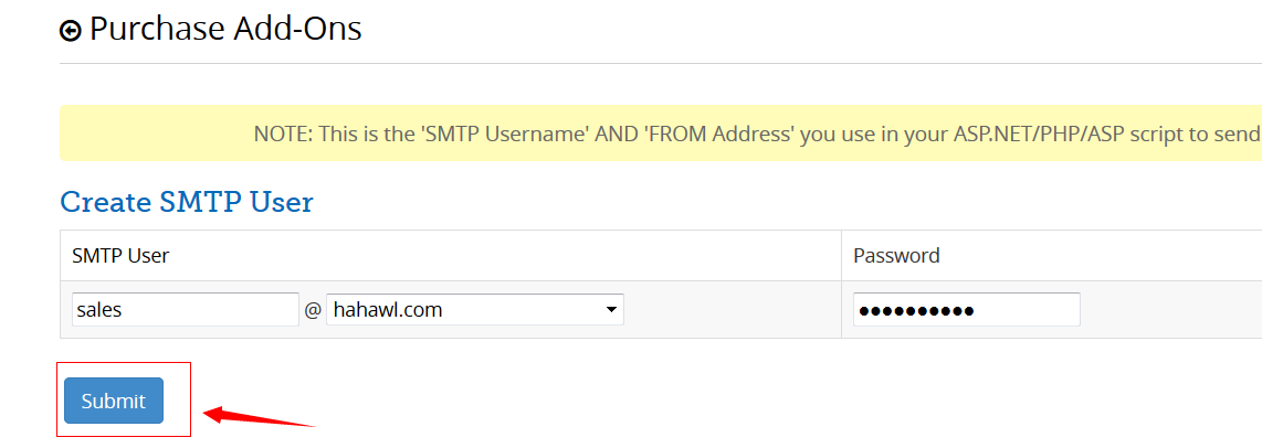 (4). Create SMTP User, click submit, and then you have done. (The Sent-Limit Product would be applied to this email account, which would be able to sent 10000 Mass emails a day.)