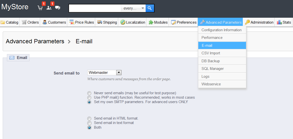 3.Go to Advace Parameters -> Emails and setup the correct smtp setting there.