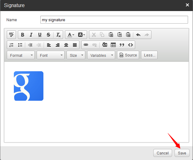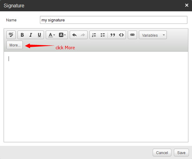 2, Please login to your email account from web mail interface-->Settings-->My settings-->Signatures-->Signatures-->Add-->More.