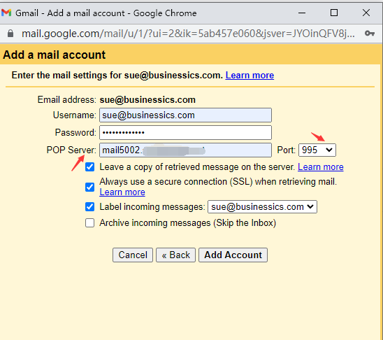 - Note that Gmail require secure connection, so we need to use SSL port. So we need to update POP3 port to 995 and specific the secure POP3 server address.