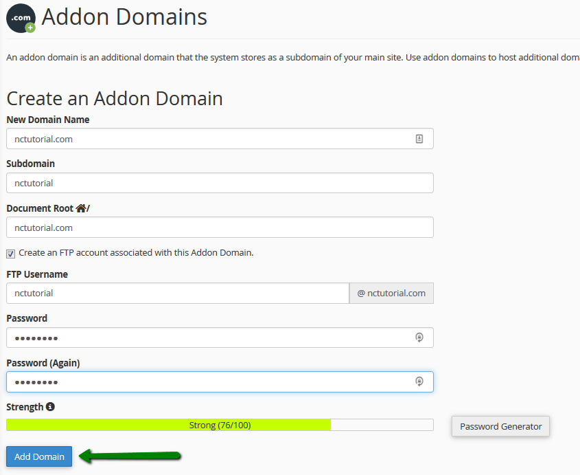 If you wish to create FTP account for your domain, checkmark Create an FTP account associated with this Addon Domain option.