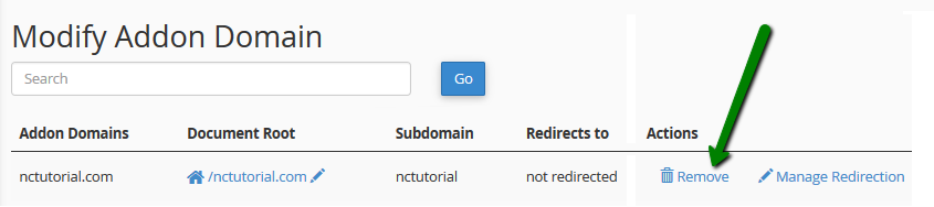 Should you need to remove an addon domain, go to the Addon domains menu > Modify Addon Domain. Click on Remove to proceed: