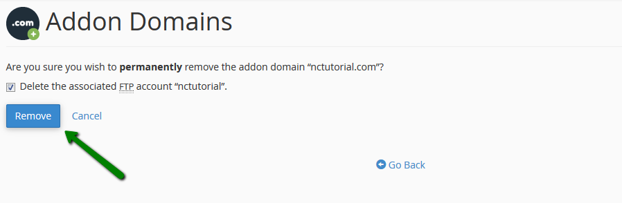 NOTE: The document root as well as the content associated with the removed addon domain will still be present in your File Manager, so if you wish these files to be deleted as well, you will need to remove the corresponding folder from File Manager manually.