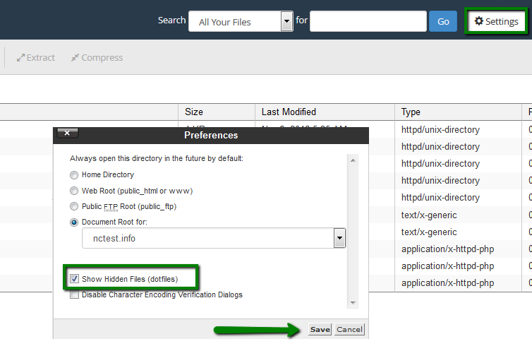 If you cannot locate .htaccess, enable Show Hidden files (dotfiles) option in Settings menu: