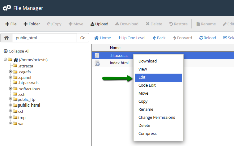 If there is still no .htaccess file in your File manager, feel free to create a new one using File option:
