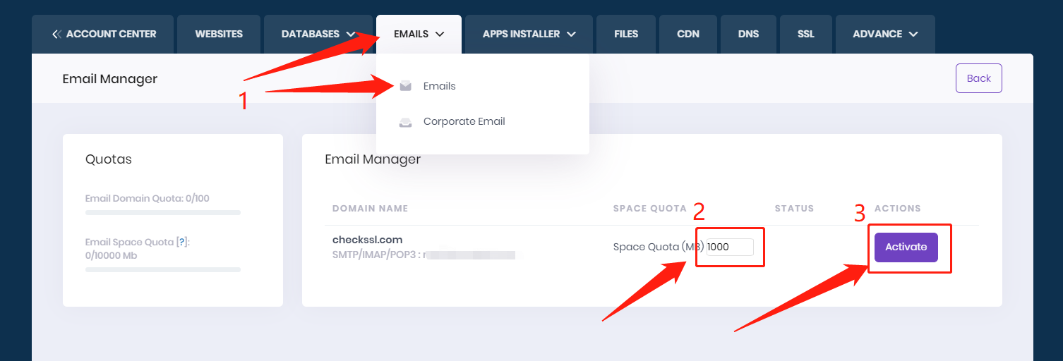 To enable the email service for your domain, you can login to your hosting control panel >> EMAILS >> Emails, then allocate the email space and click Activate button.