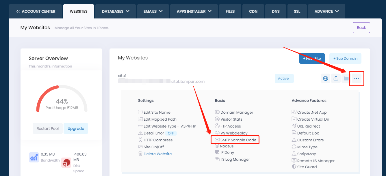 To get the Sample codes, please simply login to your hosting control panel --> click "..." at right of your site --> click "SMTP Sample Code".