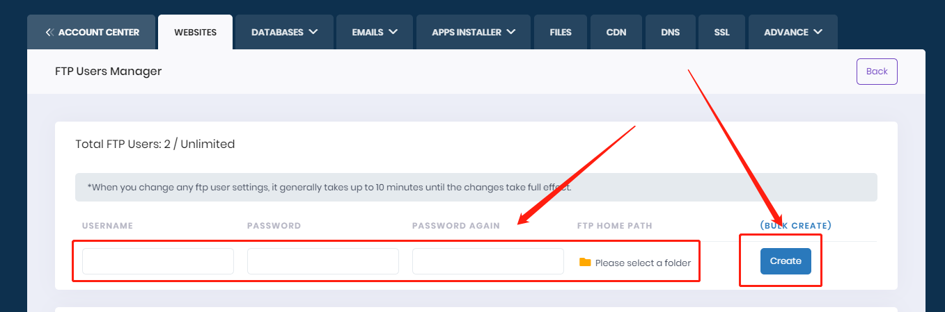 2. Fill your new FTP account info and choose ftp path, then click "Create".