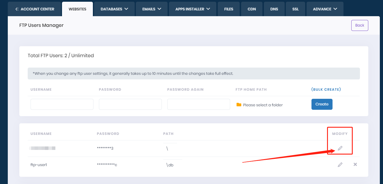 2. Click the icon under "MODIFY" --> Fill new password and submit.