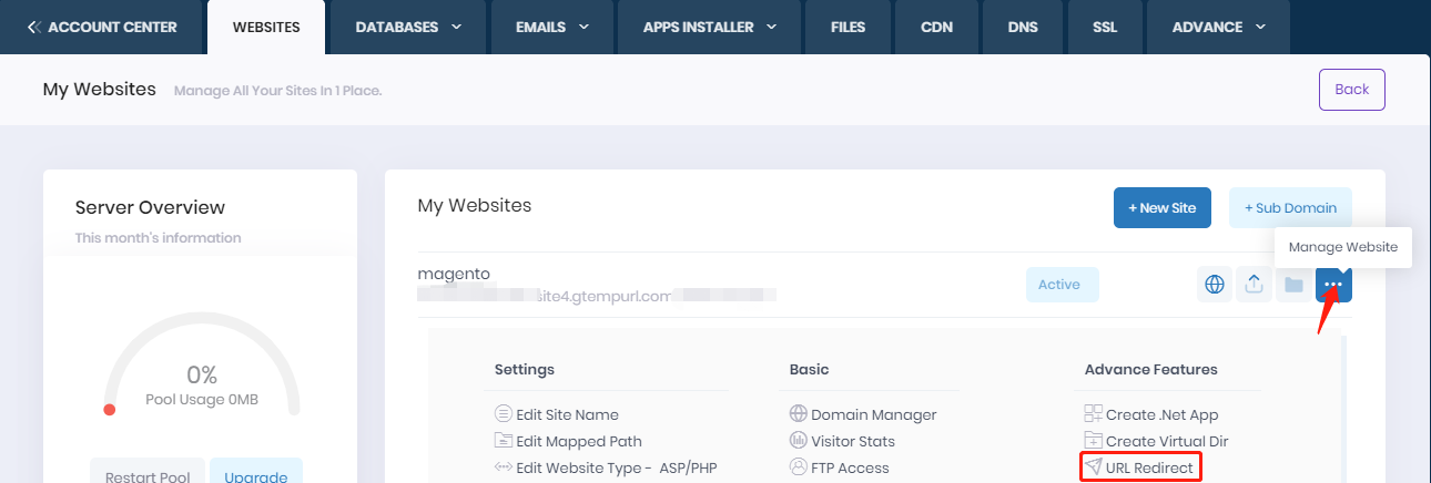Please login to your hosting control panel-->WEBSITES --> My Websites --> Select the target site --> Click Manage Website, then click "URL Redirect" to set it up.