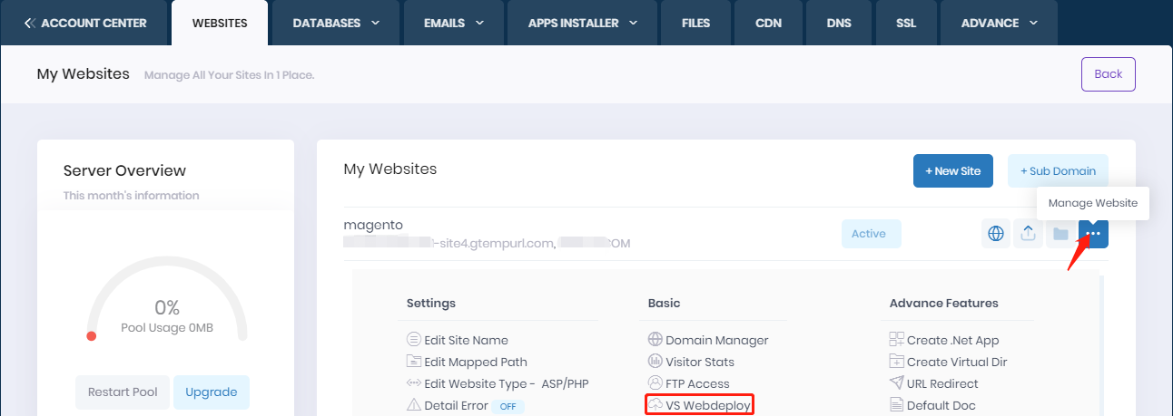 Web Deploy (msdeploy) simplifies deployment of Web applications and Web sites to IIS servers. We full support web deploy feature and you can refer the following instruction to find your web deploy info.