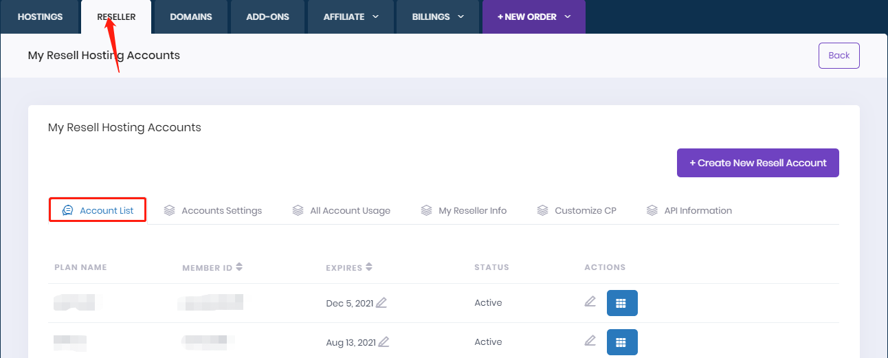 Login to your member account, click "RESELLER" from the top navigation, you can view your resell accounts from "Account list"