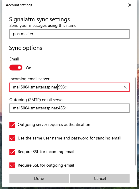 Click on "Incoming and outgoing mail server info". It seems windows mail ask for secure connect to the mail server. So you will need to use the secure address and port. You can get your domain email secure address and port info from Control Panel ---> Emails ---> Manage users"a