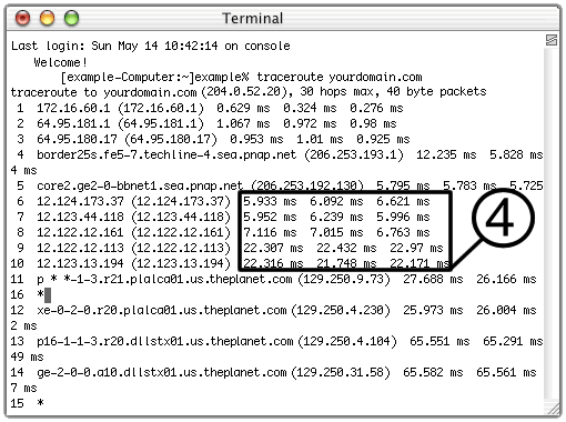 4.Check for times between hops that are greater than 200 ms or that return asterisks *** which indicate that your request has timed out.