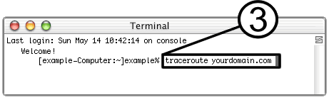 3. Type traceroute followed by your domain name, and hit Enter.In this example, example.com is used. Be sure to replace example.com with your actual domain name.