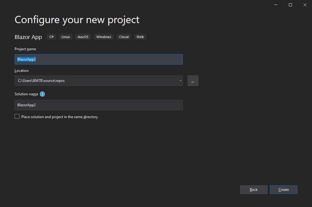 4. Choose the .net core version and choose the Blazor App type, then click "Create" button to create your Blazor App.