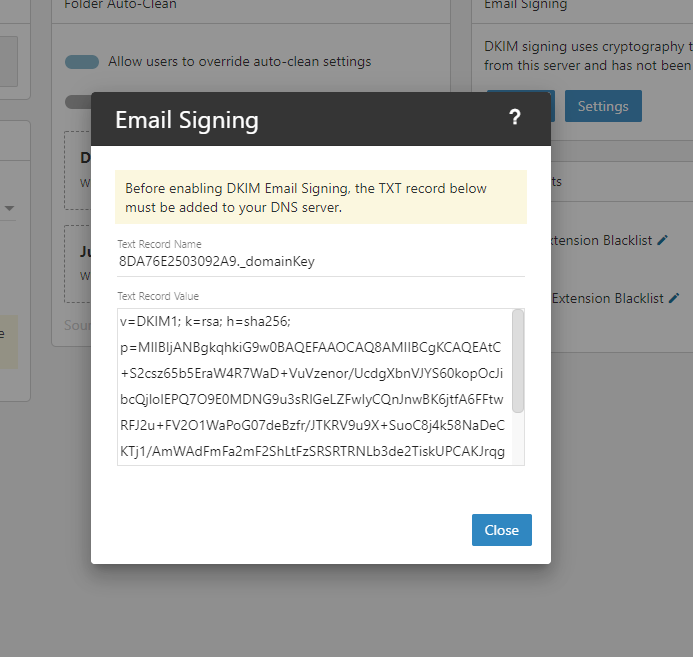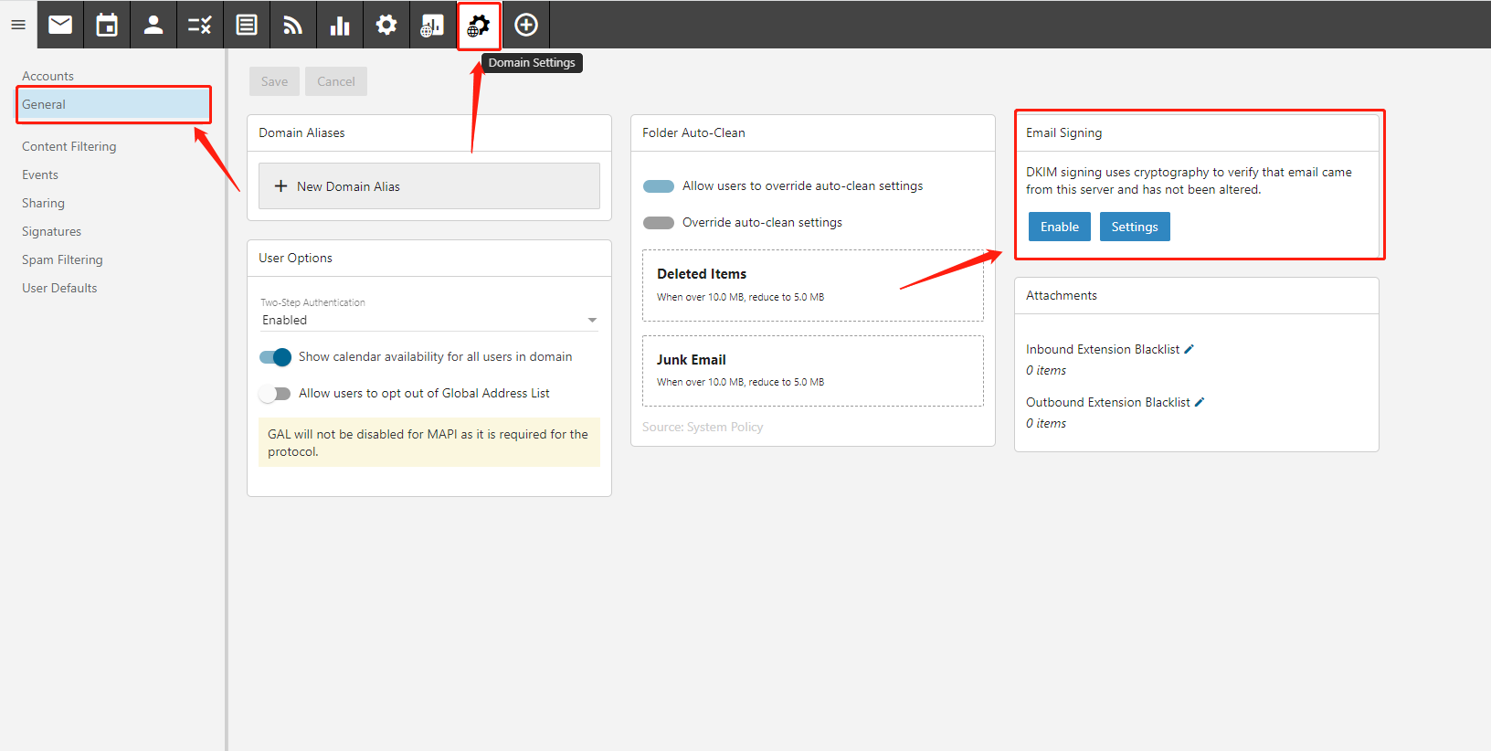 Login to your webmail interface by using the postmaster email user(the management user), then go to Domain Settings>>General to enable the DKIM.