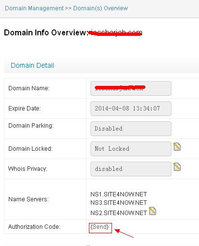 3. On the page, click 'Send' link beside Authorization Code, you will get the Authorization/EPP code sent to your domain administrator contact email account.
